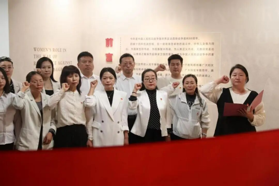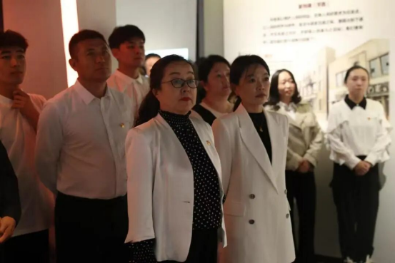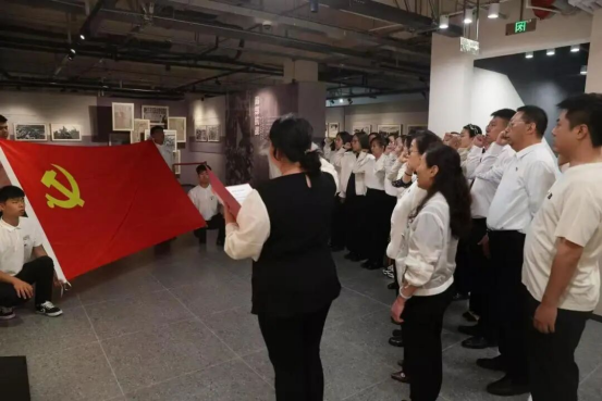 在长春文化历史博物馆展区前,全体党员整齐列队高举右拳重温入党誓词,以铿锵之声回望初心、承诺担当。